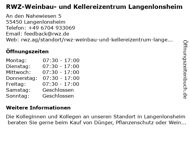 2 RWZ Agrar- und Weinbauzentrum Sprendlingen (Entfernung: 7,84 km) Gau-Bickelheimer Straße 78, 55576 Sprendlingen 4 RWZ-Kellerei- und Agrarzentrum Ingelheim (Entfernung: 12,31 km) Neisser Straße 10, 55218 Ingelheim am Rhein 6 |