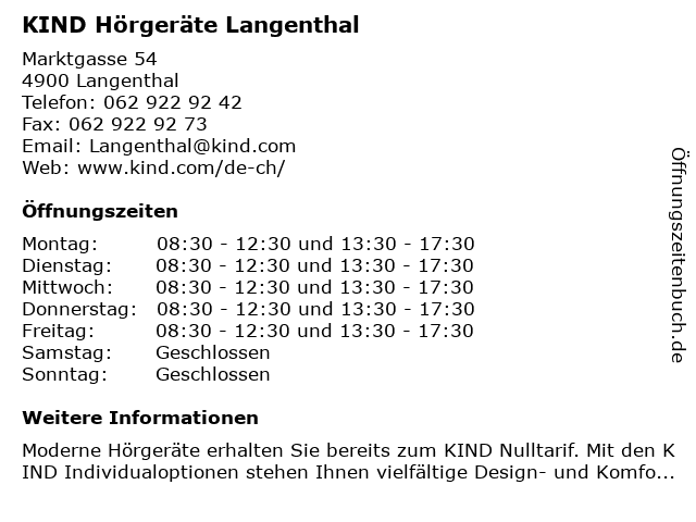 | Öffnungszeiten KIND Hörgeräte Langenthal in Langenthal anzeigen | |