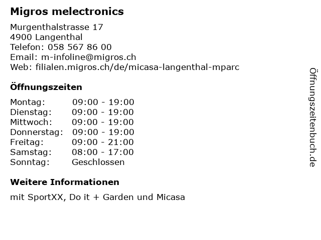 | Öffnungszeiten Migros melectronics in Langenthal anzeigen | |