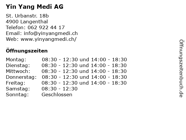 | Öffnungszeiten Yin Yang Medi AG in Langenthal anzeigen | |