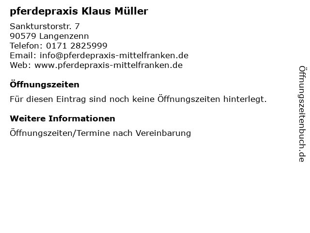 | Öffnungszeiten pferdepraxis Klaus Müller in Langenzenn anzeigen | |