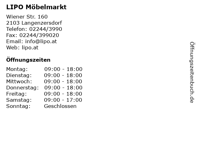 | Öffnungszeiten LIPO Möbelmarkt in Langenzersdorf anzeigen | |