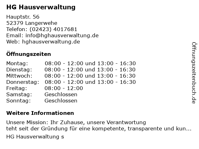 | Öffnungszeiten HG Hausverwaltung in Langerwehe anzeigen | |