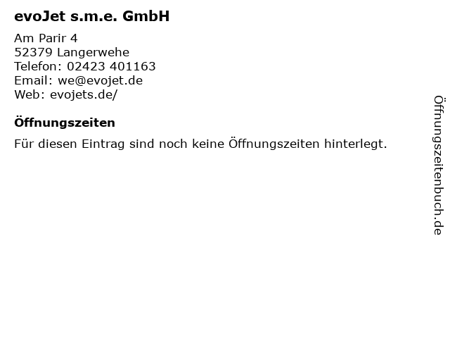 | Öffnungszeiten evoJet s.m.e. GmbH in Langerwehe anzeigen | |