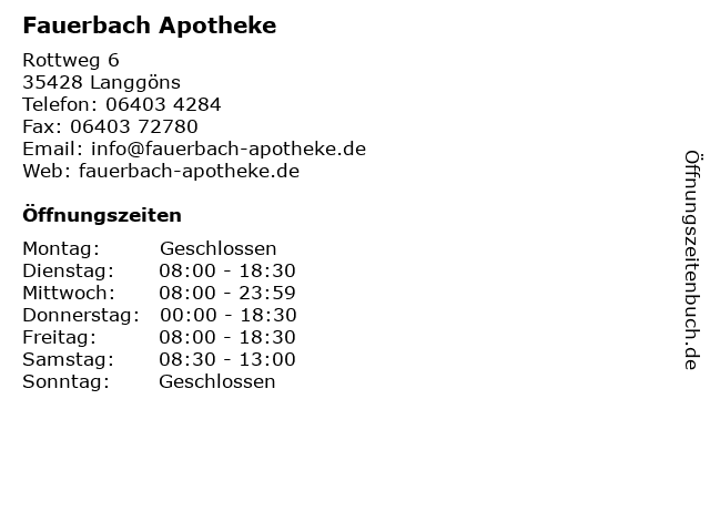 | Öffnungszeiten Fauerbach Apotheke in Langgöns anzeigen | |