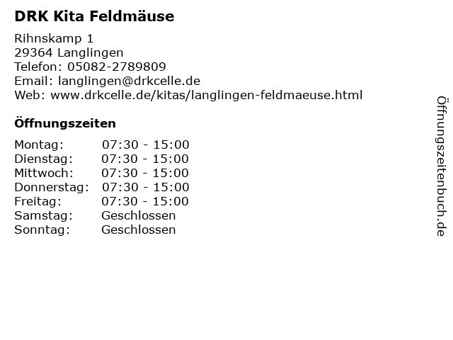 | Öffnungszeiten DRK Kita Feldmäuse in Langlingen anzeigen | |