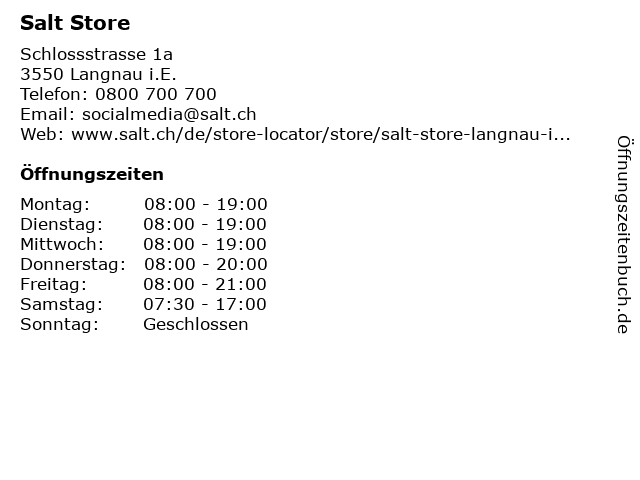 | Öffnungszeiten Salt Store in Langnau i.E. anzeigen | |