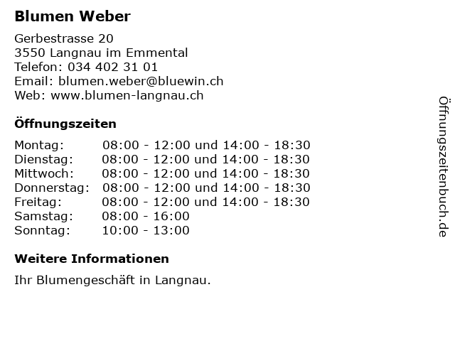 | Öffnungszeiten Blumen Weber in Langnau im Emmental anzeigen | |