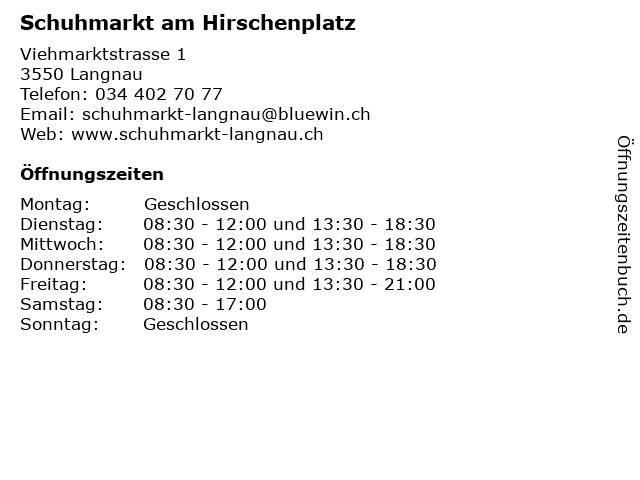 | Öffnungszeiten Schuhmarkt am Hirschenplatz in Langnau anzeigen | |