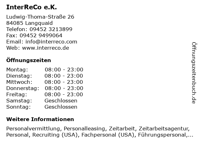 | Öffnungszeiten InterReCo e.K. in Langquaid anzeigen | |