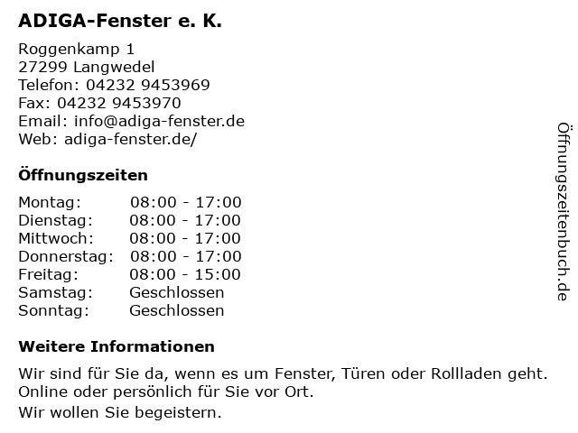 | Öffnungszeiten ADIGA-Fenster e. K. in Langwedel anzeigen | |
