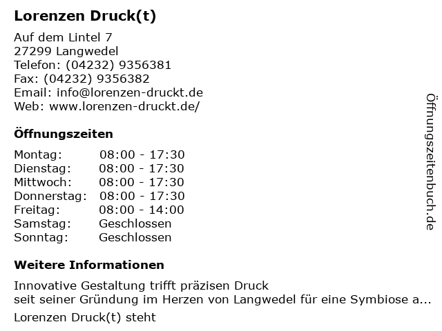 | Öffnungszeiten Lorenzen Druck(t) in Langwedel anzeigen | |