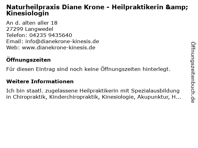 | Naturheilpraxis Diane Krone - Heilpraktikerin & Kinesiologin anrufen | |