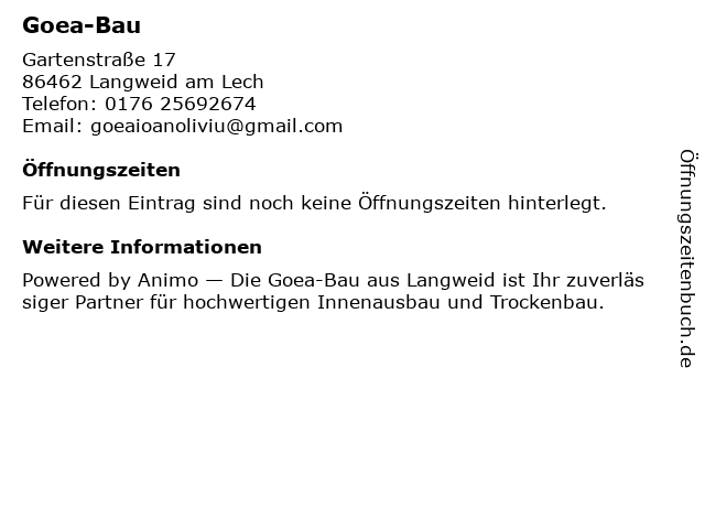 | Öffnungszeiten Goea-Bau in Langweid am Lech anzeigen | |