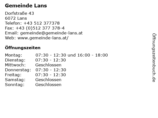 | Öffnungszeiten Gemeinde Lans in Lans anzeigen | |