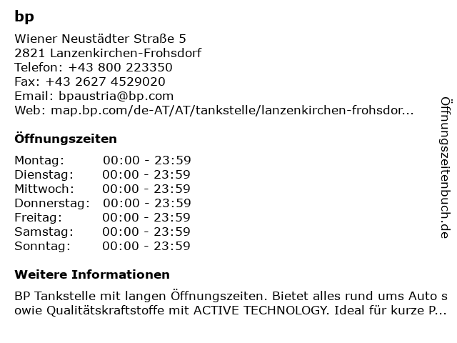 | Öffnungszeiten bp in Lanzenkirchen-Frohsdorf anzeigen | |