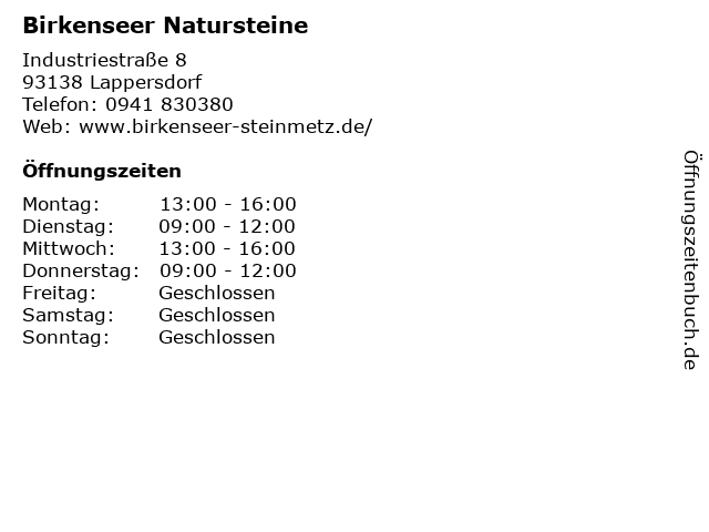 | Öffnungszeiten Birkenseer Natursteine in Lappersdorf anzeigen | |