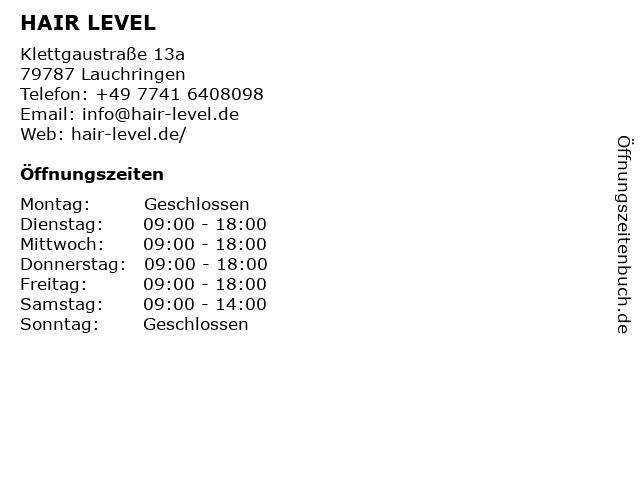 | Öffnungszeiten HAIR LEVEL in Lauchringen anzeigen | |