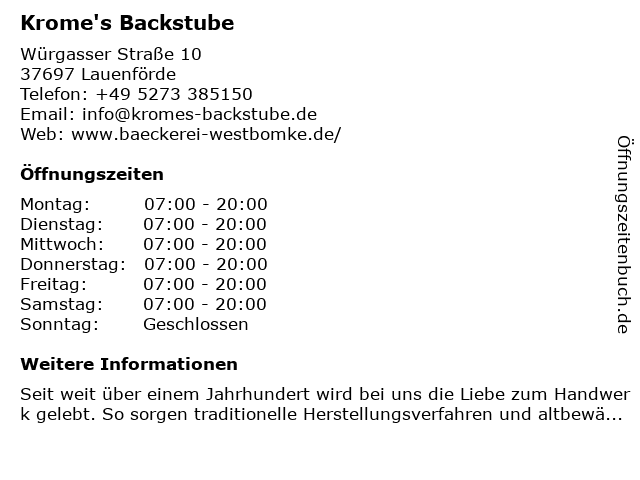 | Öffnungszeiten Krome's Backstube in Lauenförde anzeigen | |