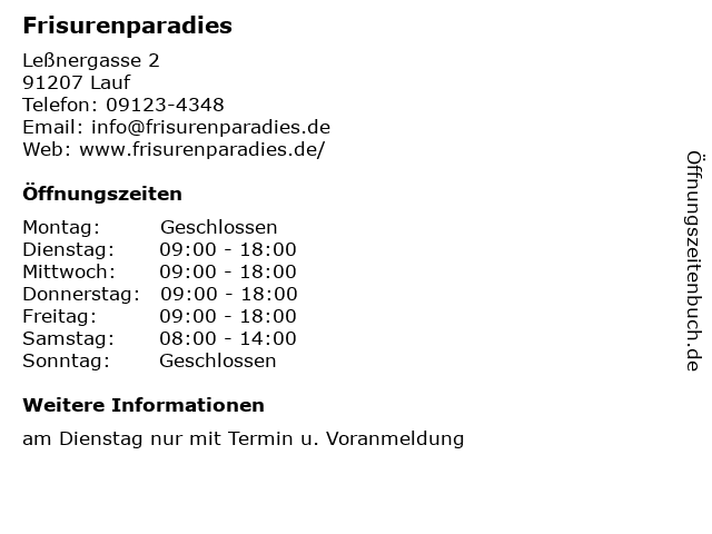 | Öffnungszeiten Frisurenparadies in Lauf anzeigen | |