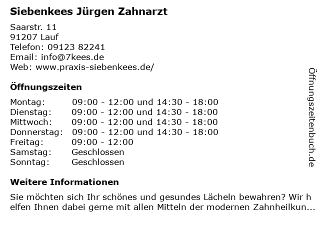 | Öffnungszeiten Siebenkees Jürgen Zahnarzt in Lauf anzeigen | |