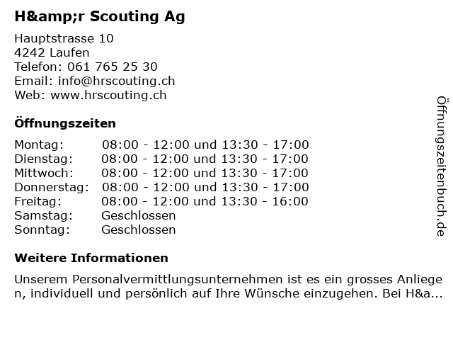 | Öffnungszeiten H&r Scouting Ag in Laufen anzeigen | |