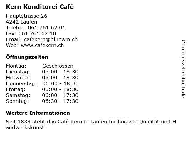 | Öffnungszeiten Kern Konditorei Café in Laufen anzeigen | |