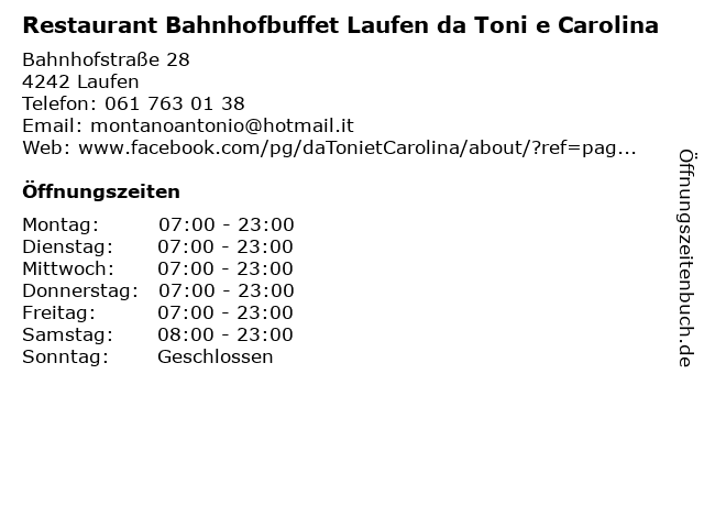 Branchen & Suchbegriffe zu Restaurant Bahnhofbuffet Laufen da Toni e Carolina:bahnhofbuffet, carolina, da, essen, getränke, laufen, pasta-gerichte, pizzas, restaurant, toni |
