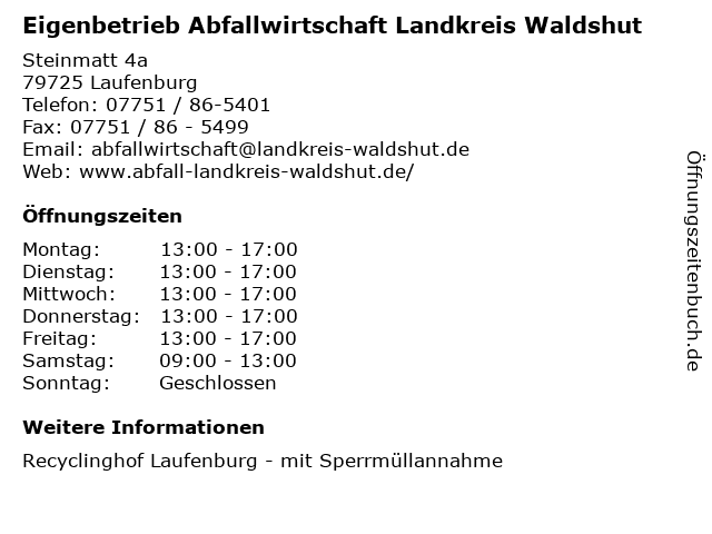 Branchen & Suchbegriffe zu Eigenbetrieb Abfallwirtschaft Landkreis Waldshut:abfallentsorgung, abfallverwertung, abfallwirtschaft, abfallwirtschft, eigenbetrieb, landkreis, wertstoffe |