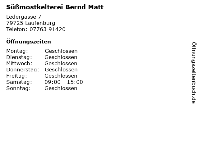 | Öffnungszeiten Süßmostkelterei Bernd Matt in Laufenburg anzeigen | |