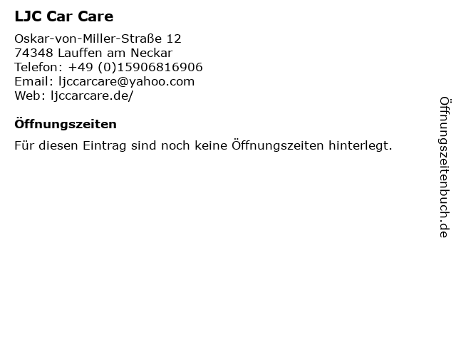 | Öffnungszeiten LJC Car Care in Lauffen am Neckar anzeigen | |