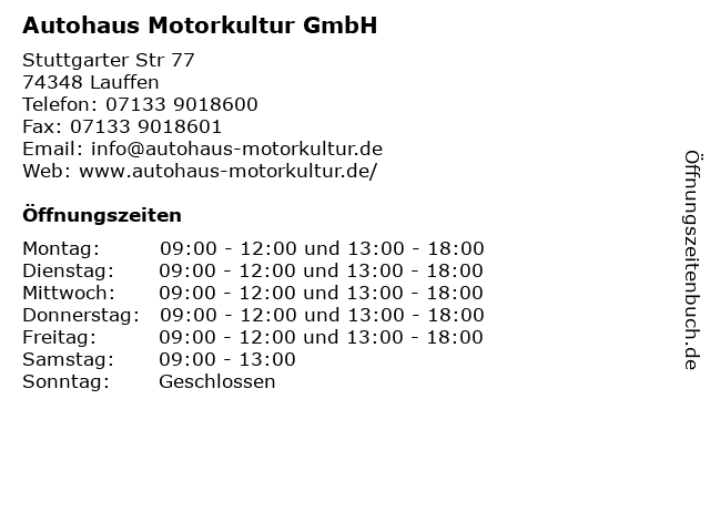 | Öffnungszeiten Autohaus Motorkultur GmbH in Lauffen anzeigen | |