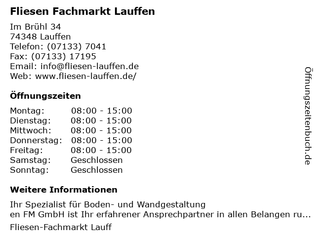 | Öffnungszeiten Fliesen Fachmarkt Lauffen in Lauffen anzeigen | |