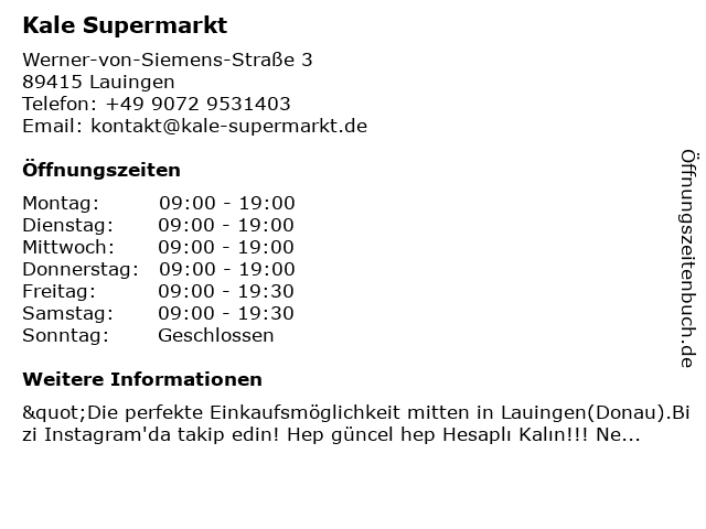 | Öffnungszeiten Kale Supermarkt in Lauingen anzeigen | |