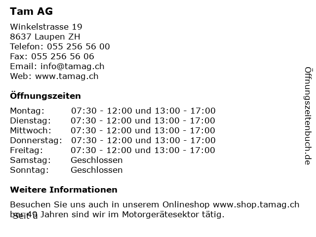 | Öffnungszeiten Tam AG in Laupen ZH anzeigen | |
