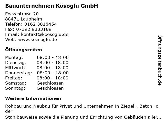 | Öffnungszeiten Bauunternehmen Kösoglu GmbH in Laupheim anzeigen | |