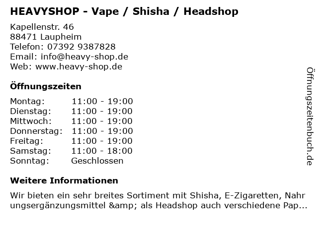 Branchen & Suchbegriffe zu HEAVYSHOP - Vape / Shisha / Headshop:headshop, heavyshop, shisha, vape |