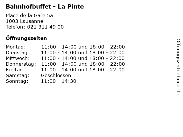 | Öffnungszeiten Bahnhofbuffet - La Pinte in Lausanne anzeigen | |
