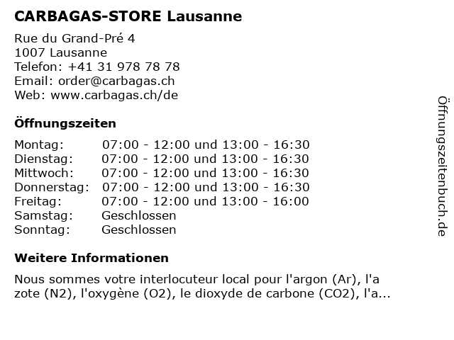 | Öffnungszeiten CARBAGAS-STORE Lausanne in Lausanne anzeigen | |