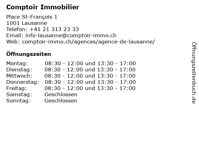 | Öffnungszeiten Comptoir Immobilier in Lausanne anzeigen | |