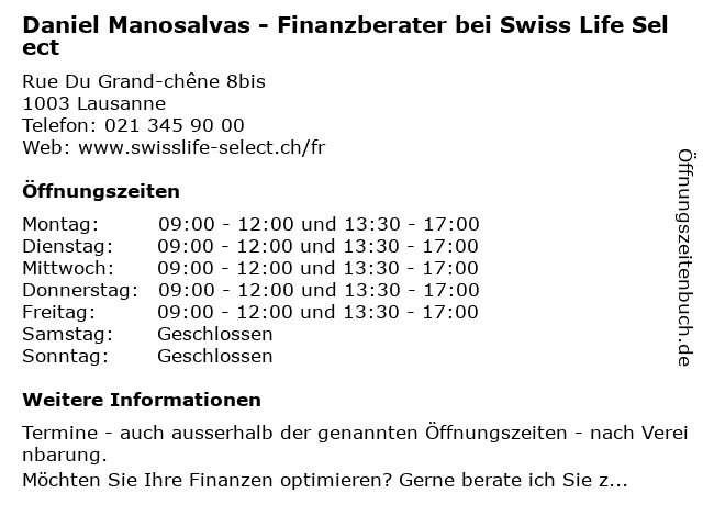 1 Cristian Panea - Finanzberater bei Swiss Life Select (Entfernung: 0,00 km) Rue Du Grand-chêne 8bis, 1003 Lausanne 2 Elodie Blatti - Führungskraft bei Swiss Life Select (Entfernung: 0,00 km) Rue Du Grand-chêne 8bis, 1003 Lausanne 3 Ronny Lê - Führungskraft bei Swiss Life Select (Entfernung: 0,00 km) Rue Du Grand-chêne 8bis, 1003 Lausanne 4 Yves-Laurent Dübi - Führungskraft bei Swiss Life Select (Entfernung: 0,00 km) Rue Du Grand-chêne 8bis, 1003 Lausanne 5 Gaël Rochat - Führungskraft bei Swiss Life Select (Entfernung: 0,00 km) Rue Du Grand-chêne 8bis, 1003 Lausanne 6 Julien Humair - Führungskraft bei Swiss Life Select (Entfernung: 0,00 km) Rue Du Grand-chêne 8bis, 1003 Lausanne |