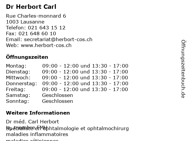 | Öffnungszeiten Dr Herbort Carl in Lausanne anzeigen | |