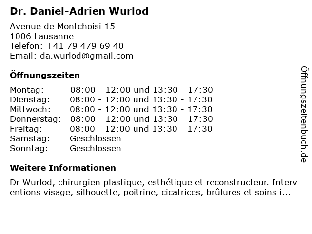 | Öffnungszeiten Dr. Daniel-Adrien Wurlod in Lausanne anzeigen | |
