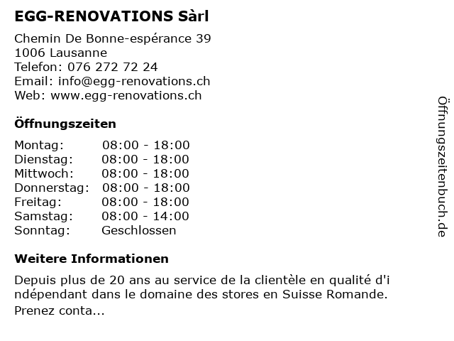 | Öffnungszeiten EGG-RENOVATIONS Sàrl in Lausanne anzeigen | |