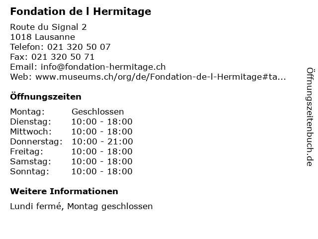 | Öffnungszeiten Fondation de l Hermitage in Lausanne anzeigen | |