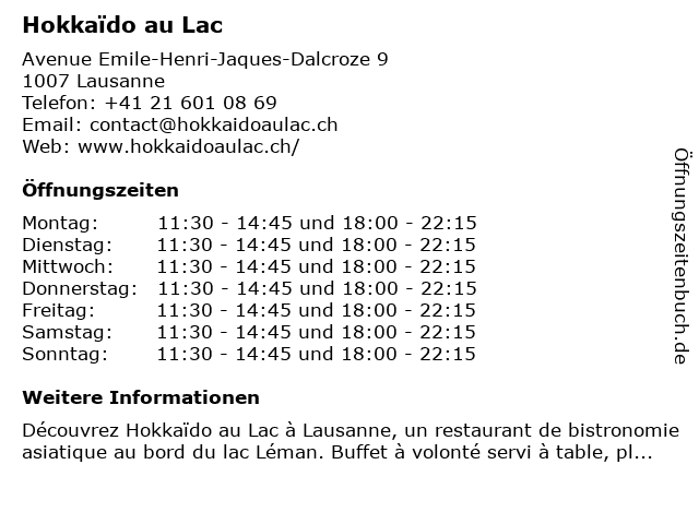 | Öffnungszeiten Hokkaïdo au Lac in Lausanne anzeigen | |