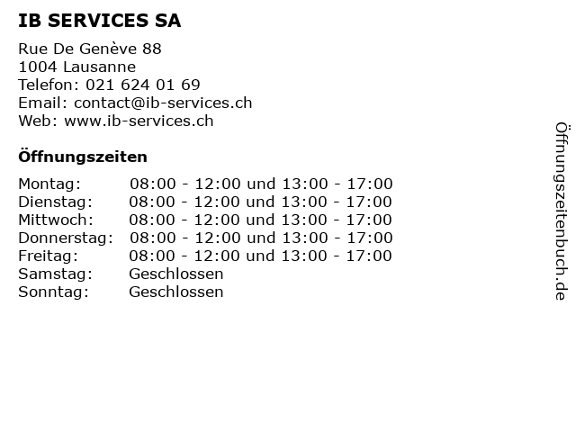 | Öffnungszeiten IB SERVICES SA in Lausanne anzeigen | |