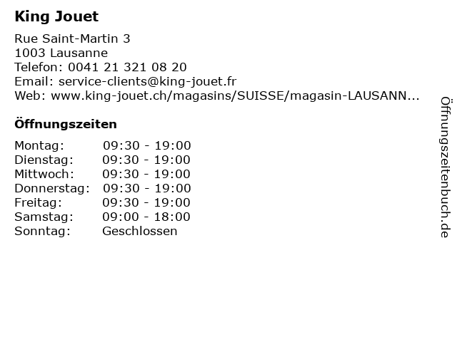 | Öffnungszeiten King Jouet in Lausanne anzeigen | |