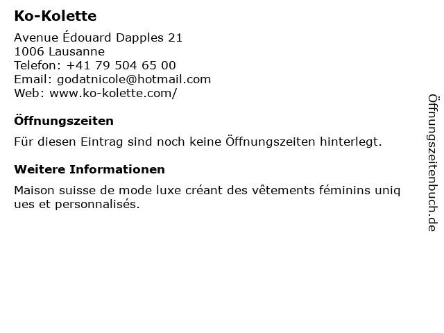 | Öffnungszeiten Ko-Kolette in Lausanne anzeigen | |
