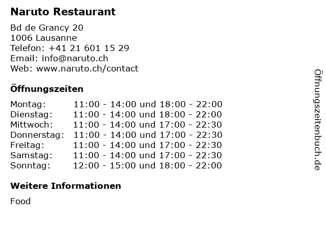 | Öffnungszeiten Naruto Restaurant in Lausanne anzeigen | |